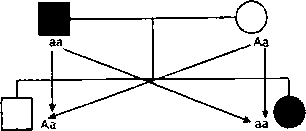 Если же он выберет жену с геном Аа (гетерозиготу по гену фенилкетонурии), то в 50 процентах случаев можно ожидать рождения больного ребенка и в 50 процентах здорового (рис. 6).